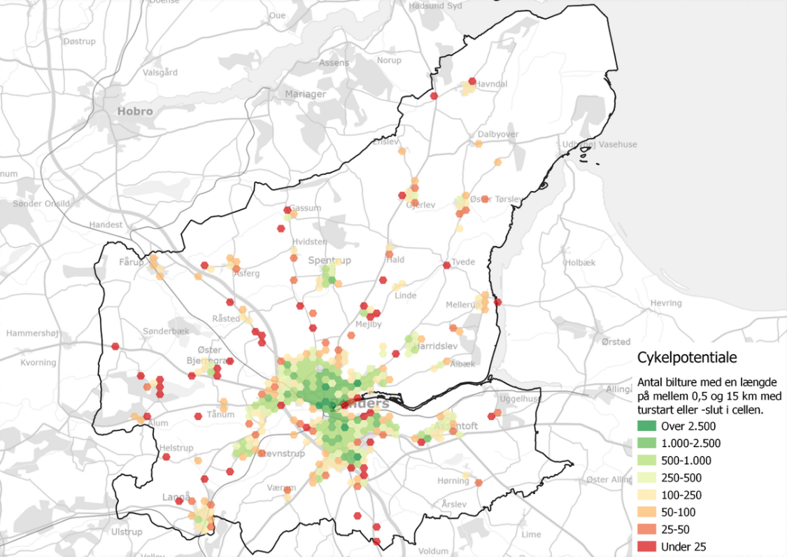 Eksempel på kortlægning af cykelpotentiale i Randers Kommune (bilture med en længde på 0,5-15 km). Cykelpotentialet vises som antal bilture med startpunkt eller slutpunkt indenfor cellen. Hvert år træffes der store beslutninger om investeringer i cykelinfrastrukturen i danske kommuner, med det formål at få flere til at skifte bilen ud med cyklen. Her er det afgørende med et solidt datagrundlag for at målrette investeringerne der hvor værdiskabelsen er størst. GPS-data fra biltrafikken kan i den sammenhæng bruges til at beregne og kortlægge hvor cykelpotentialet er størst.