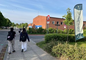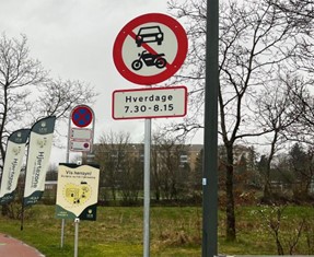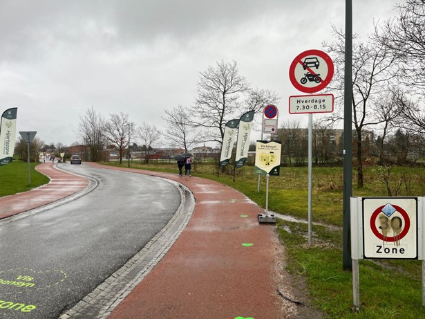 Hjertezone ved NOVAskolen i Vejle. Her ses indkørselsforbuddet på en af de centrale veje forbi skolen, samt synliggørelsen af hjertezonen med beachflag, vejkantplakater og markering på belægning.