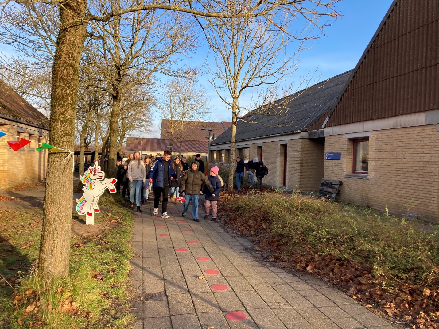 Billede 2: Røde prikker og solcellelys viser eleverne på vej det sidste stykke fra parkeringspladsen.